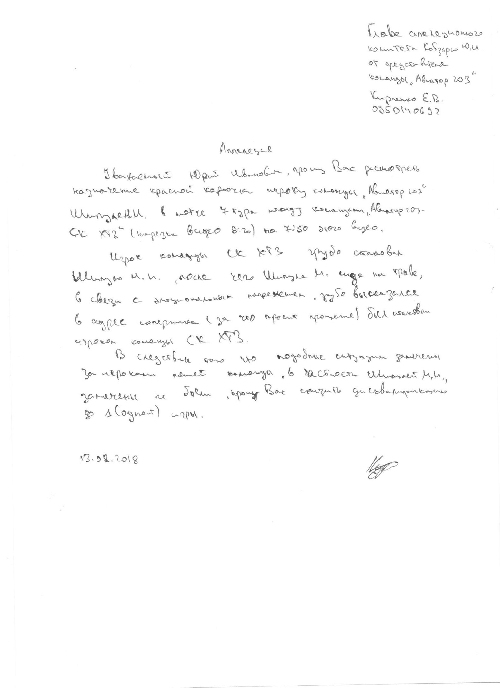 Апелляционный комитет рассмотрел апелляцию команды Авиатор 203, на игру 7го тура 17 кубка Харькова между командами Авиатор 203 - Ск ХТЗ в эпизоде 07.50мин. (нарезка), апелляционный комитет постановил: