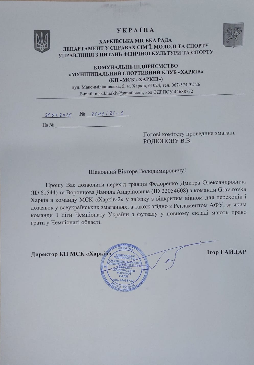 Звернення МСК Харків-2 з приводу переходу гравців