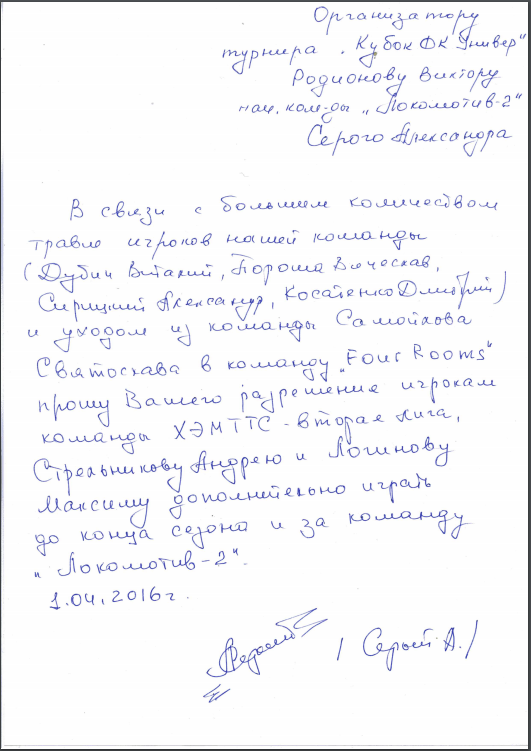 В Оргкомитет турнира поступило письмо от представителя команды Локомотив-2 Серого Александра с просьбой разрешить игрокам Стрельникову Андрею и Логинову Максиму (воспитанникам Локомотива) которые на данный момент выступают за команду ХЭМТТС-2 разрешить до конца сезона дозаявиться и в команду Локомотив-2 не уходя из ХЭМТТС, в связи с травмами ведущих игроков. Оргкомитет рассмотрел заявление и принял единогласное решение удовлетворить просьбу команду Локомотив-2.