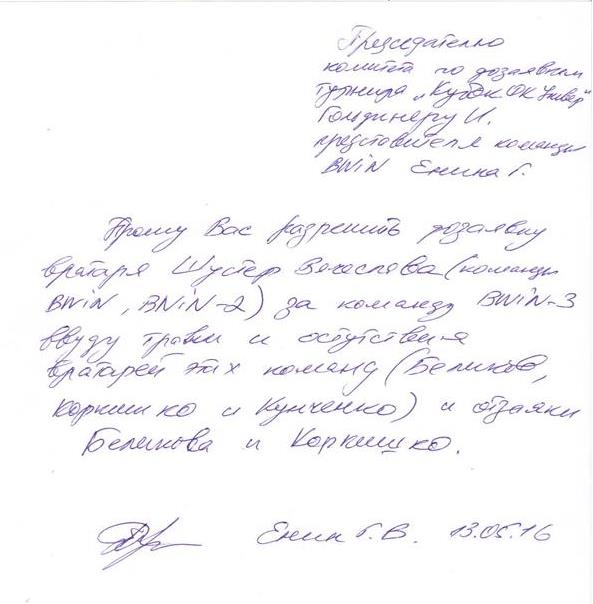 - Разрешить команде Bwin-3 дозаявить вратаря Шустера Вячеслава. Отзаявить следующих игроков: Беликова Сергея и Коркишко Евгения.