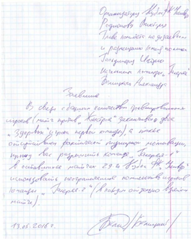 В Оргкомитет турнира поступило письмо от команды Галерея с просьбой разрешить игрокам команды Галерея-2 выступать за первую команду не в количестве 2-х игроков, а больше, в связи с травмами ведущих игроков первой команды. Оргкомитет рассмотрел письмо и разрешил удовлетворить просьбу команды Галерея.