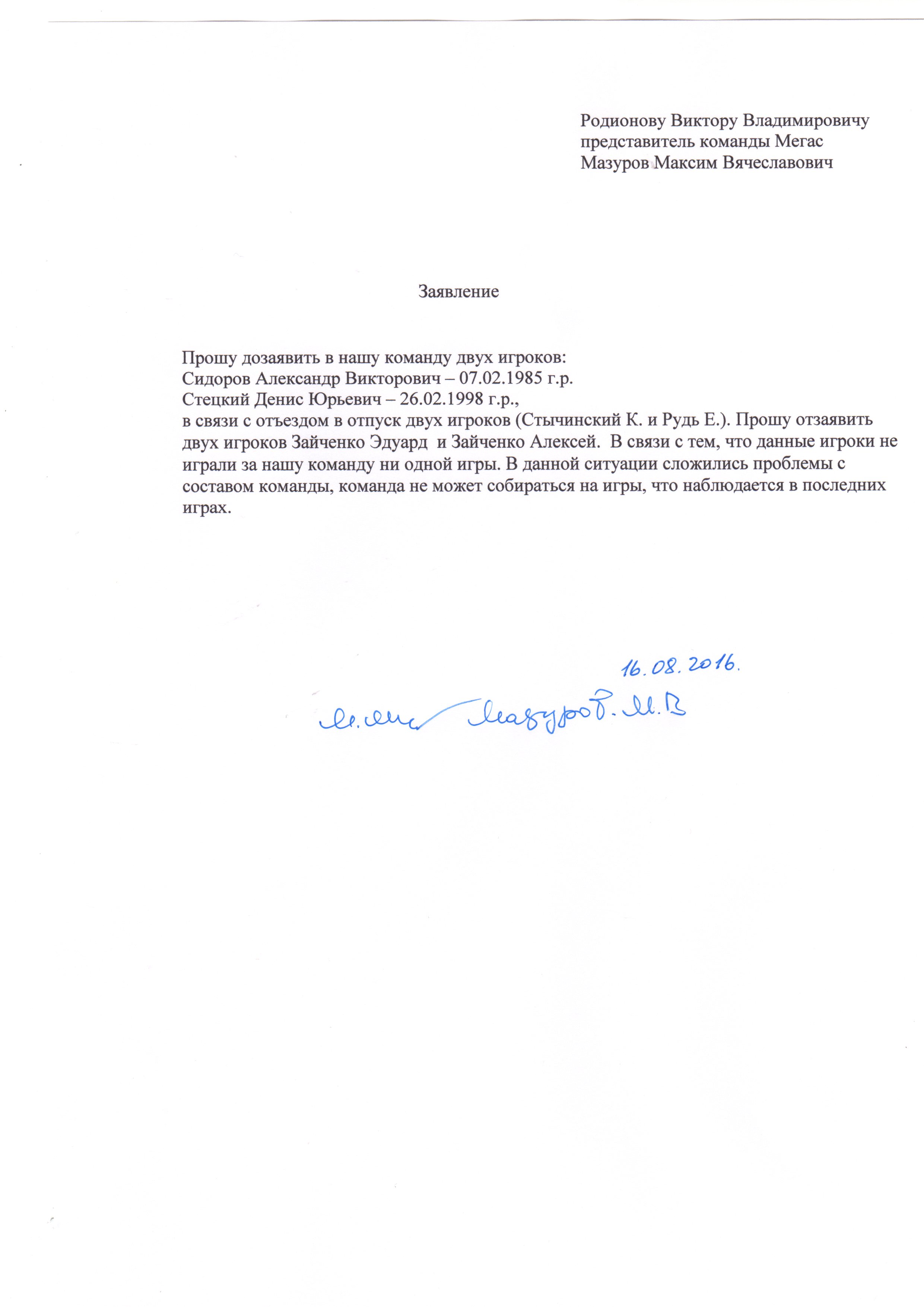 Решение оргкомитета относительно дозаявки команды Мегас