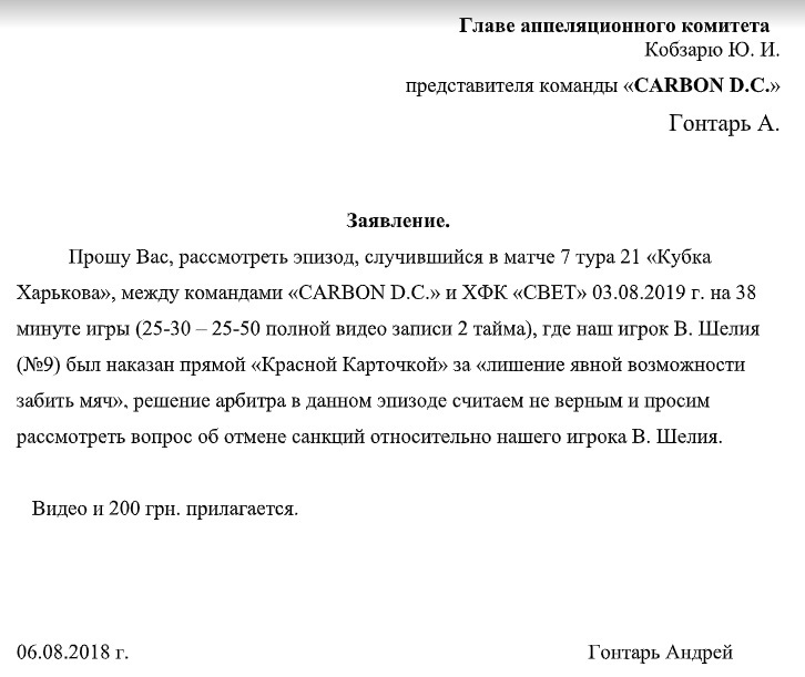 Апелляционный комитет рассмотрел апелляцию команды Carbon D.C. на матч 7 тура, 5 лиги 21 Кубка Харькова между командами Carbon D.C. – ХФК Свет в эпизоде 25:30 2 тайма по видео.