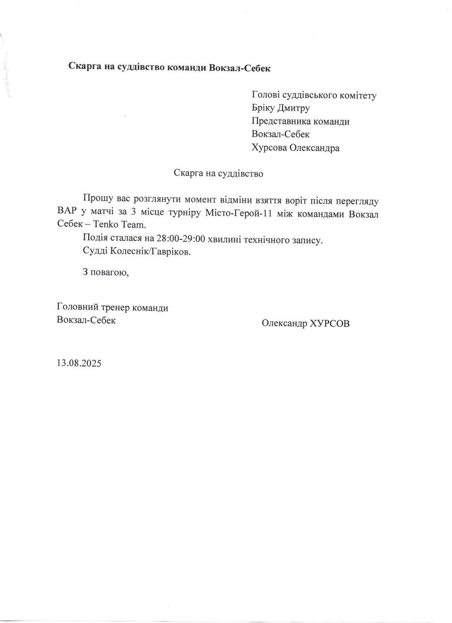 Розглянувши Вашу скаргу від 13.08.2025 р. та вивчивши відеоматеріали гри за 3 місце 1 ліги між командами «Вокзал - Себек» – «Tenko Team», суддівський комітет вирішив: