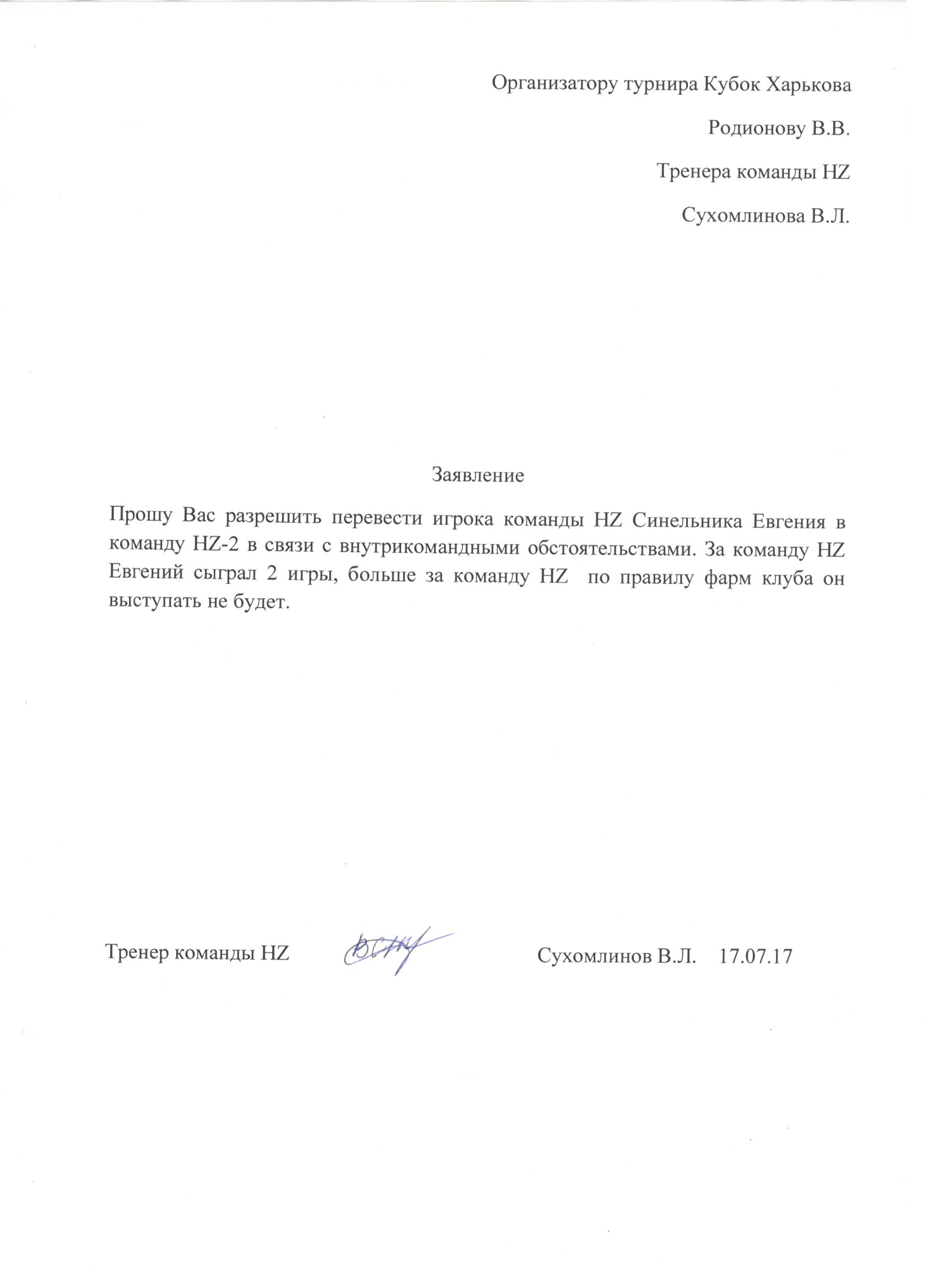 Оргкомитет турнира, рассмотрел письмо команды HZ и принял решение разрешить переход Синельнику Евгению в команду HZ-2 без возможности выступать за команду HZ.