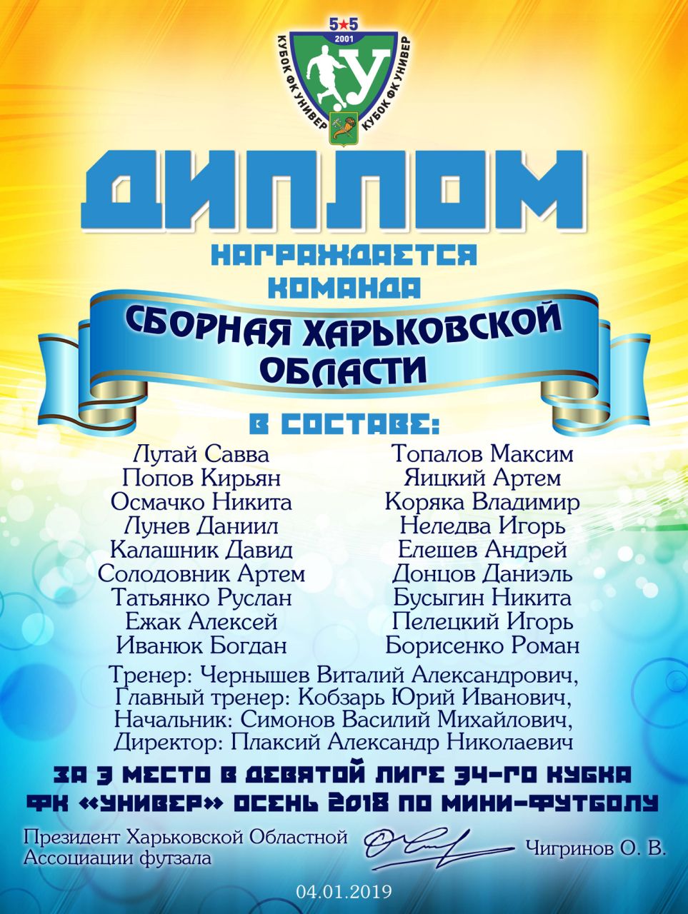 Юношеская сборная команда Харьковской облсасти участвует не только в Чемпионате Украины среди юношей. Также команда принимает участие в крупнейшем аматорском турнире города Харькова Кубок ФК "Универ". Турнир длялся с сентября до 30 декабря 2018 г., где в среднем все команды сыграли 16 игр. В турнире было 12 лиг, с Высшей по 11 лигу. Наши ребята выступали в 9-й. В каждой лиге было 10 команд, После кругового этапа, команды разбивались на 2 пятерки и еще играли один круг в пятерках. Далее сильнейшие играли плей-офф по схеме 1-8, 2-7, 3-6, 4-5 из двух четверть финалов, полуфинала и финала. В четверть финале Сборная встречалась с командой Draft-2 где в первой встрече взяла уверенную победу со счетом (5:2), а во второй матч закончился со счетом (4:4). В полуфинале Юноши уступили студенческой команде танкового училища Булат с минмальым счетом (1:2). А в финале за 3 место с небольшим преимуществом обыграли команду Triоlan (4:3).