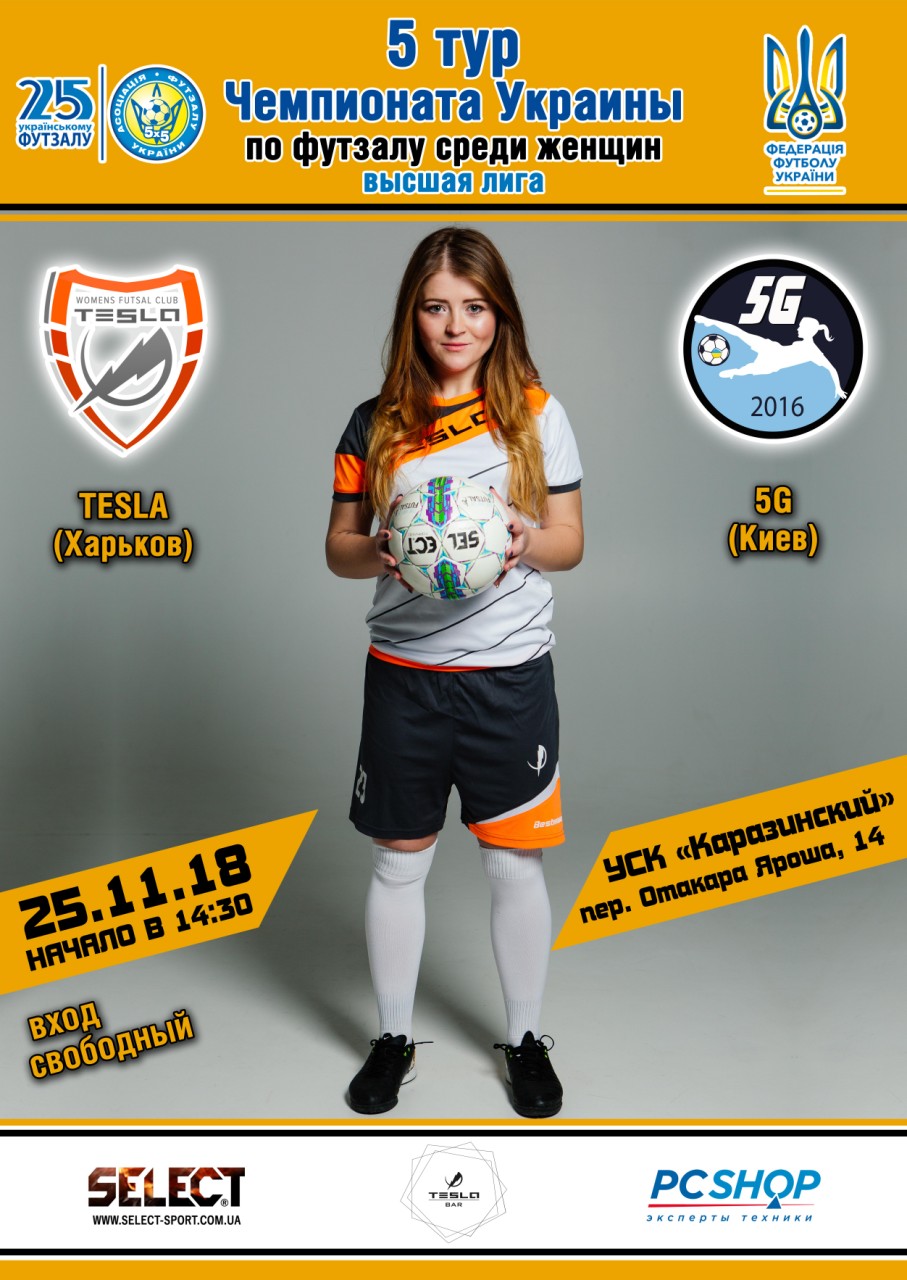 Приглашаем всех любителей спорта поддержать харьковскую женскую футзальную команду TESLA  в Чемпионате Украины по футзалу среди женщин в Высшей лиге. В 5 туре соперником харьковчанок станет команда 5G г. Киев. Матч состоится 25.11.18 по адресу пер. Отакара Яроша 14, УСК "Каразинский", начало 14-30. Вход свободный.