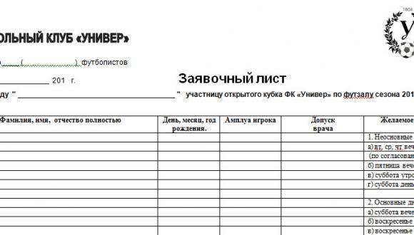 Допуск врача, фамилия, имя, отчество, день, месяц, год рождения игрока, официальные лица команды, желаемое время проведения игр.
