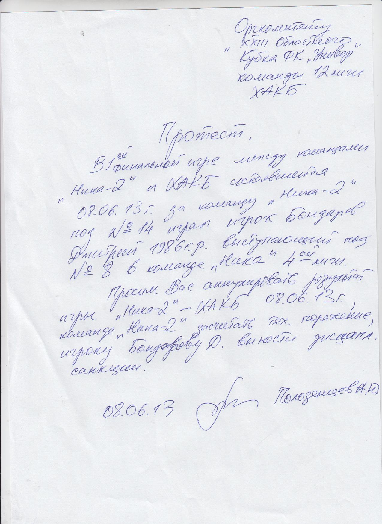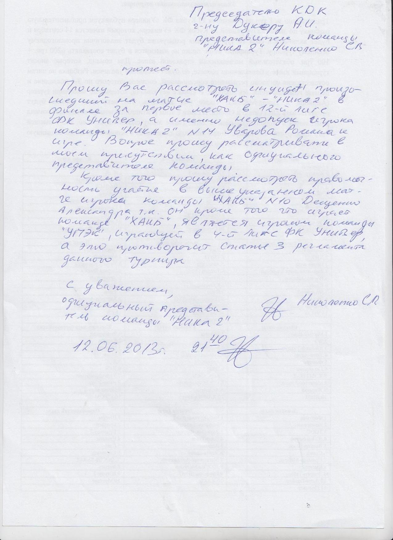 08.06.2013г. согласно регламента соревнований в Оргкомитет поступил протест от команды ХАКБ ее представителя Полозенцева А. Ю., в котором указывается участие в игре незаявленного игрока Ники 2 Болдырева Д.,являющегося игроком команды НИКА 4 лиги. КДК установил, что незаявленный игрок Болдырев Д. выступающий под фамилией Уваров, неимел права участвовать в этой игре. Согласно п.6 ст.18 команде НИКА 2 присуждается поражение 0:5, а игрок команды Болдырев Д. дисквалифицируется на 6 месяцев от 08.06.2013 года.