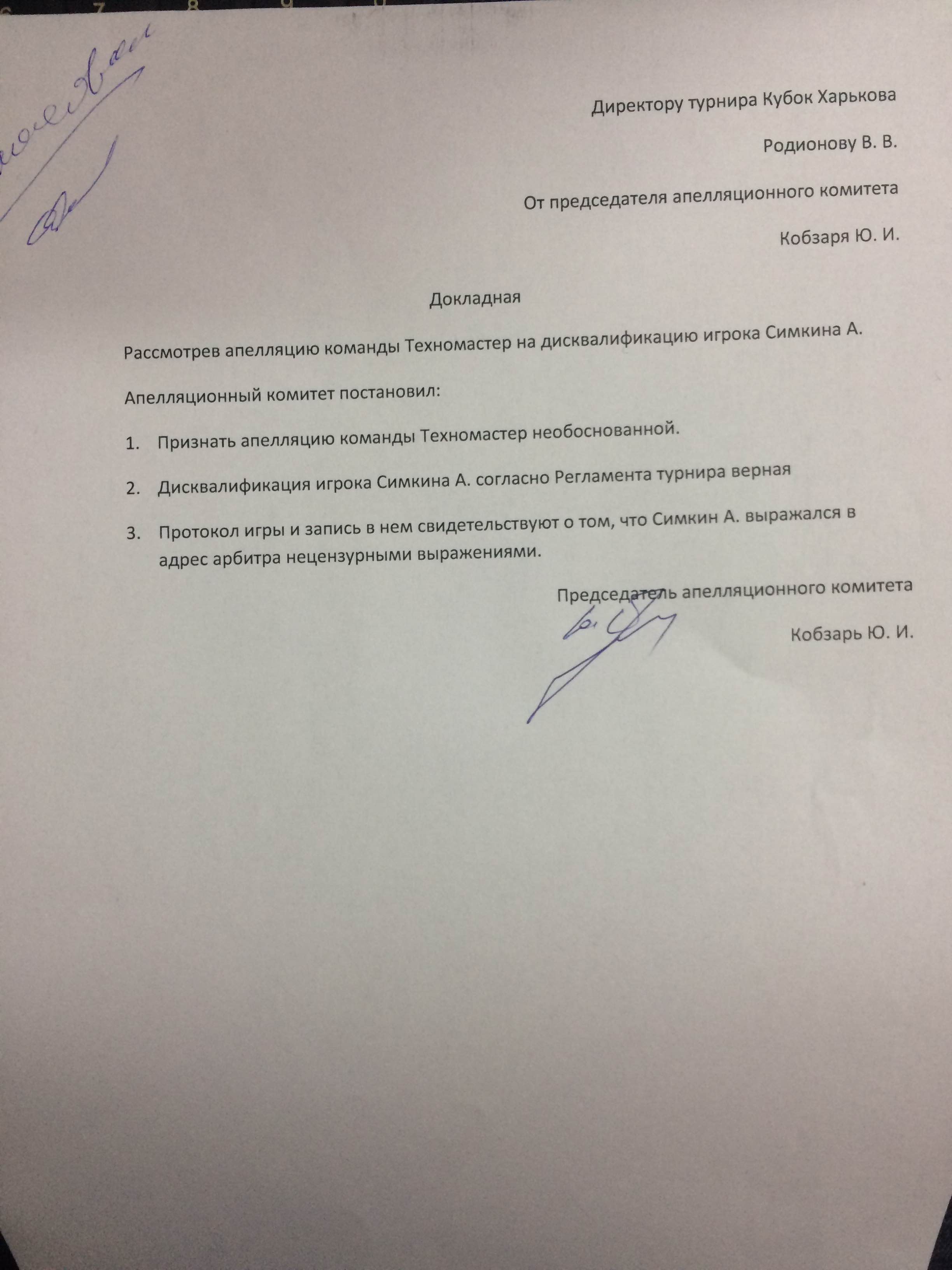 Ответ на апелляцию команды Техномастер